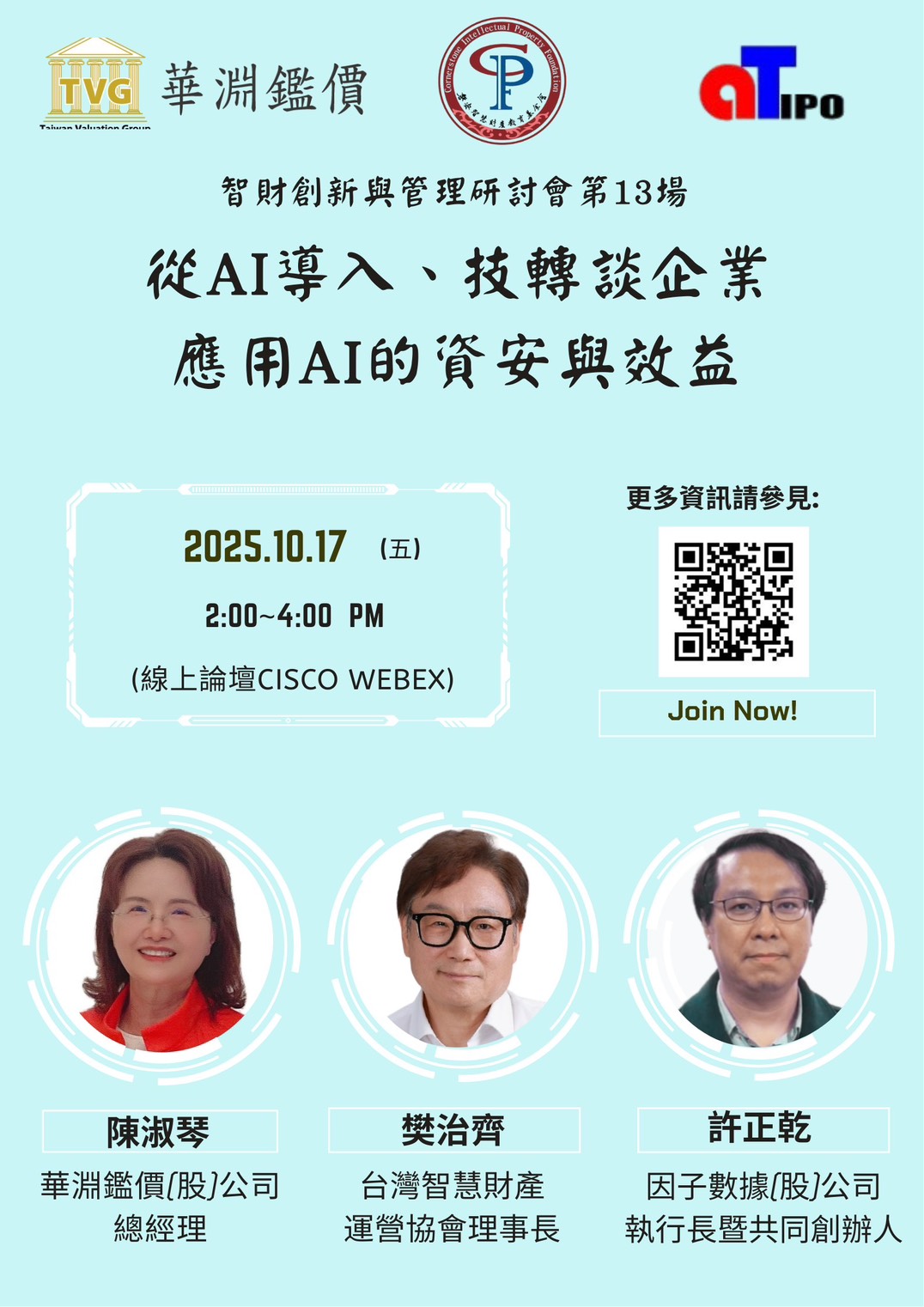活動主題:華淵鑑價-智財創新與管理研討會第13場「從AI導入、技轉談企業應用AI的資安與效益」線上研討會