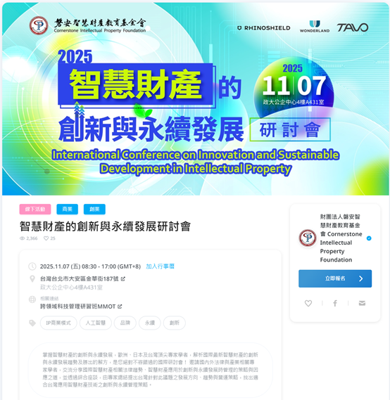 聚焦 #創新 與 #永續 國際智慧財產盛會,集結來自 歐盟、日本、台灣 等地的專家學者與企業高層,共同探討智慧財產在AI時代、永續發展與新創生態新趨勢。